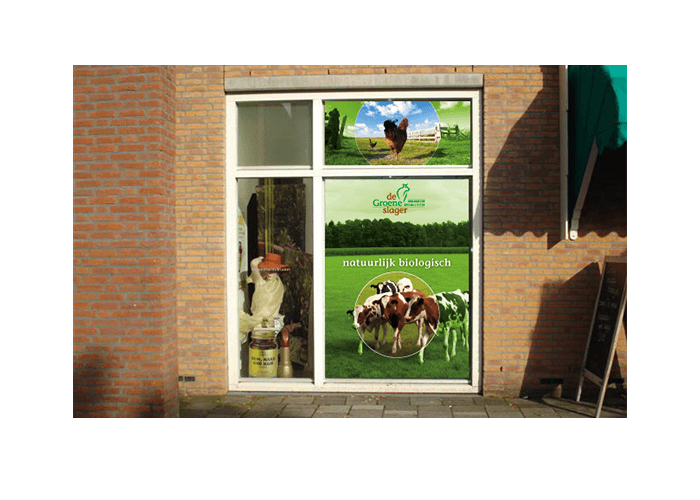 Voor de winkelruiten van De Groene Slager in Alkmaar hebben we een ontwerp gemaakt dat geheel in lijn ligt met de filosofie van de slagerij. Het is per ruit op maat gemaakt en in spiegelschrift op zelfklevende folie geprint. De folie is daarna aan de binnenzijde van de ruiten geplakt.