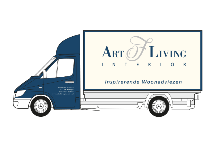 Voor Art of Living werden zowel de cabine als de laadbak in de huisstijlkleuren gespoten. Daarna werd de belettering aangebracht.