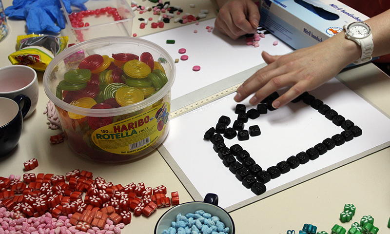 Ze begon met vijf ontwerpen op de computer. Na ieders volle tevredenheid, vervolgde ze haar weg naar de groothandel. Met als buit heel veel snoep, lijm en stevig karton. Urenlang sorteerde onze Lotte de snoep op type en kleur. Dagenlang kwam er een mierzoete walm uit het snoepkamertje. Zo moet het hebben geroken bij Charlie’s chocoladefabriek.